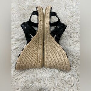 Black, patent leather strappy wedge sandals/heels with esparto rope wedge/platform accented by black, metal