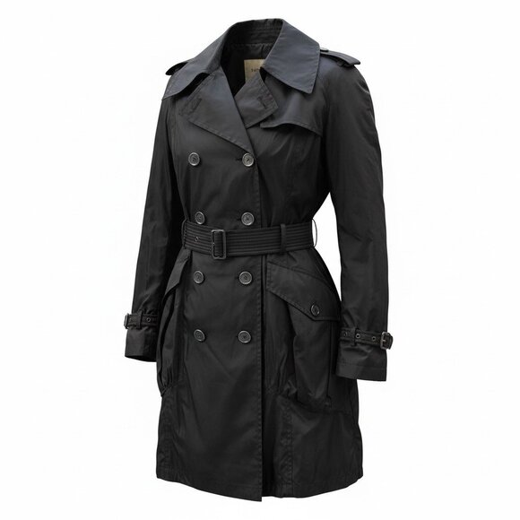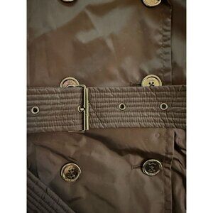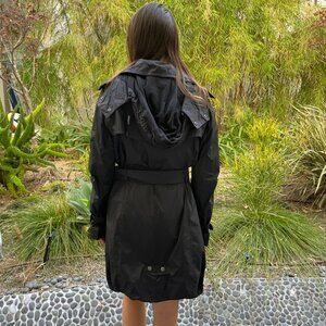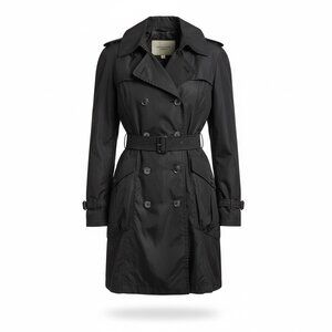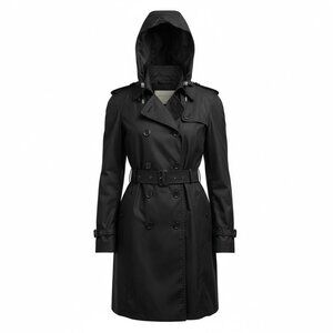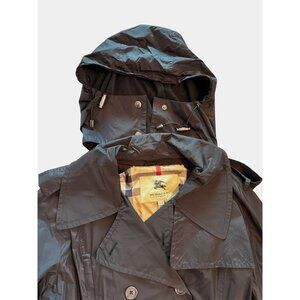 Description: This gorgeous Burberry raincoat is in perfect condition. Double-breasted button closure with a belt & buckle, patch pockets, pointed collar and Nova check pattern. Has a detachable hood with a zipper.