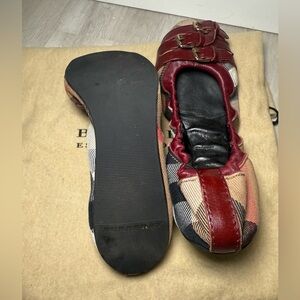 Experience the elegance of Burberry with these red and black flats, designed for both style and comfort. Crafted with the iconic Burberry check pattern, these shoes offer a sophisticated touch to any outfit. The flat sole ensures all-day wearability, making them perfect for any occasion.