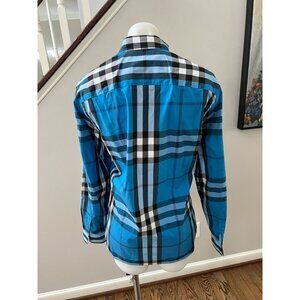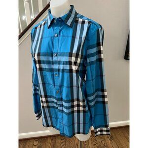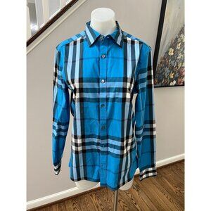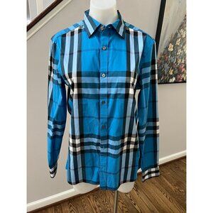 BURBERRY Brit Mens Nelson Checked Plaid Cotton Shirt Blue Black Size Small
