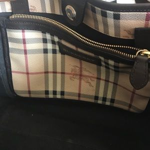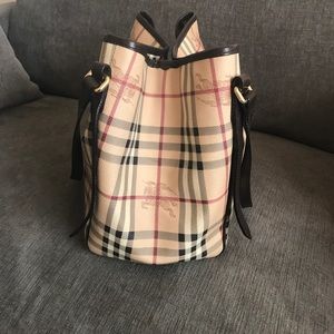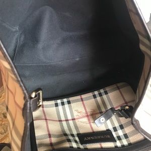 perfect for casual wear. Crafted in brand's signature Burberry haymarket pattern with dark brown leather trimmings, this lightweight bag features leather shoulder straps, protective base studs, and gold-tone hardware accents. Its magnetic snap closure opens to a spacious dark grey fabric-lined interior perfect for storing daily essentials. Authenticity code reads: ITSTY27CAM. Excellent condition with Minor wear. Features a detachable pouch. Handle Drop 8", Height 11", Width 10", Depth 6.5"