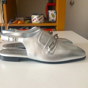 Trending loafers in a slingback design and metallic leather with chain-links adorning the vamp.