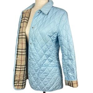 Light blue Burberry quilted jacket with the classic Burberry check lining visible at the opening and cuffs.