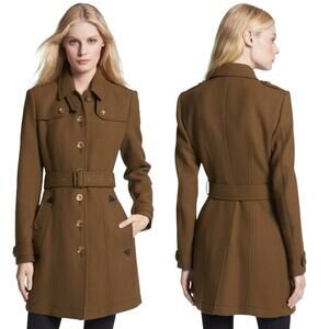 Elevate your cold-weather wardrobe with this timeless Burberry brown wool coat. Featuring a tailored military trench silhouette, this designer piece is crafted from high-quality soft wool, lambskin leather accents and lined for warmth and comfort. The coat includes a belted waist, button front closure, and sleek pocket detailing for a flattering and functional fit. Iconic Burberry craftsmanship shines through in every stitch, making it a luxurious and sophisticated choice for fall and winter.