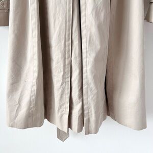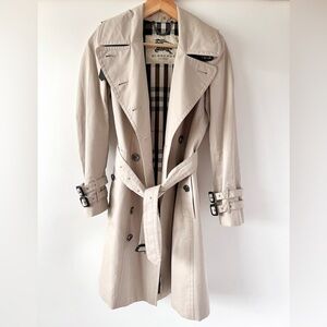 Classic BURBERRY (unsure of the style ) longer length heritage trench coat in timeless beige. Features a tailored yet comfortable fit, leather-buckle throat latch, belted waist, epaulettes, cuff straps, and signature Burberry check lining. Made in Bosnia from 100% cotton with leather trim. Size UK 6 / US 4 / ITA 38 / GER 34. A refined and versatile trench perfect for both casual and professional wear.
