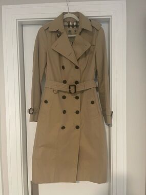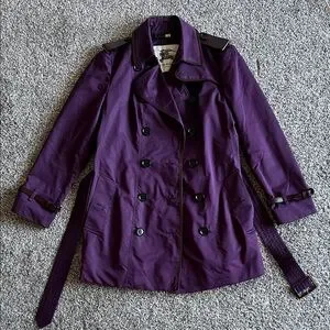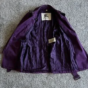 Stylish Burberry trench in a deep purple hue. Double-breasted front with classic button details. Belted waist for a defined silhouette. Epaulettes and cuff straps add tailored accents. Versatile outerwear for polished looks.