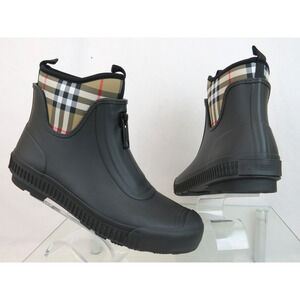 BURBERRY FLINTON BLACK RUBBER BEIGE CHECK SOCK LOGO ANKLE RAIN BOOTS US 11 EU 41