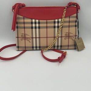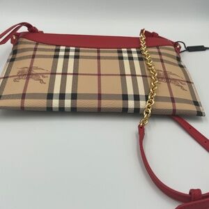 Authentic BURBERRY Haymarket Check Peyton Crossbody Clutch Bag with Red. T matching adjustable leather cross body shoulder strap and the top zipper opens to a Burberry jacquard fabric interior 4 card slots