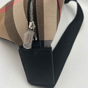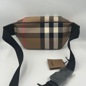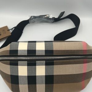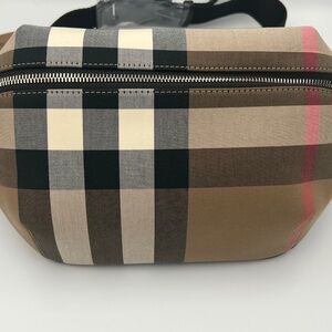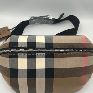 BURBERRY House Check Sonny Bum Bag in Taupe Brown.belt bag black leather trim, a rear zipper pocket, a black nylon belt, and silver hardware. The top zipper opens to a black fabric interior with a black leather pocket New with tags, dust bag included