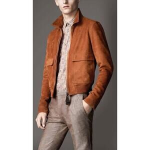 BURBERRY LONDON jacket comes in a brick nubuck leather featuring a blouson style, oversized utility pockets, ribbed hem, and a zip up closure. Made in Italy,