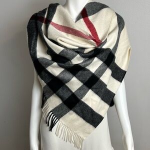 BURBERRY LONDON HALF MEGA 100% CASHMERE BANDANA SCARF WRAP Luxurious Burberry scarf in black, red and cream with fringe. Colors are cream (off white), red and black. Made in Scotland. 167cm by 85cm. No rips. *Does have 2 tiny holes as pictured. One hole doesn’t go all the way through. Pen head size. A few small spots. Have not tried to treat spots. So might come out. See video. Can’t see when it’s wrapped around you. Hand wash. Smoke free home.