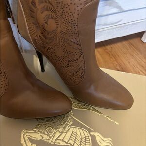 Small stain on upper leather of left boot as shown in pic with the arrow. Have original box that does show wear but boots show very little wear. Extra heel tips included. No dust bag.