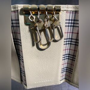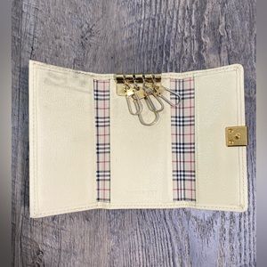 BURBERRY Leather Key Holder Wallet. Leather exterior and interior. Nova check pattern on interior. Gold hardware. Snap closure. Some wear on leather and hardware.