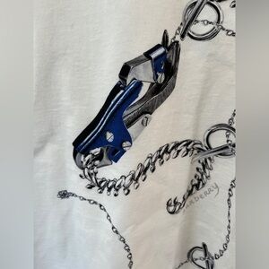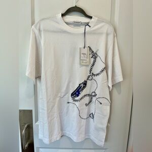 This Oversized 100% Authentic NWT Burberry Knight Hardware Graphic T Shirt has a hand painted melded-motif graphic joining Burberry hardware among signature jewelry patterns fresh from the 2024 Jewelry Collection.