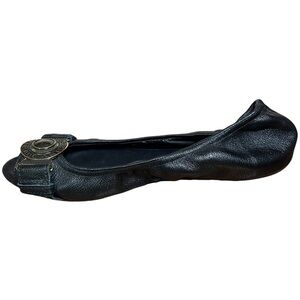 Beautiful, authentic pair of ladies Burberry black leather slip-on ballet flat shoes with bronze “Burberry” medallion buckle