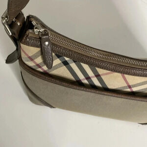 This shoulder bag features a nylon body with leather trim, a front exterior slip pocket, a flat leather strap, a top zip closure, and interior zip and slip pockets.