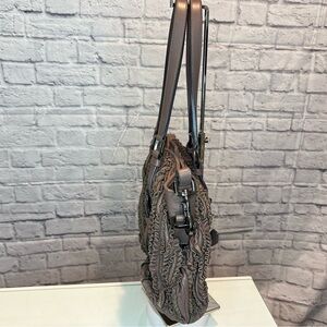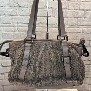The attention to detail in the leather ruffles makes this bag so amazing. Color is a lavender/purple with gunmetal hardware.