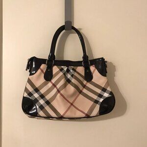 An authentic Burberry top handles shoulder bag made of black/white/red/tan nylon, black patent leather trim, and pewter-tone hardware. The interior is lined with beige fabric and it consists of one major compartment and three side pockets of which one has a zipper and two are slip pockets. Two side pockets on interior of bag. The bag is in good condition.