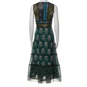 Burberry silk patchwork dress with a flowing skirt and structured top.
