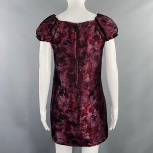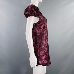 BURBERRY PRORSUM cocktail dress in a burgundy and purple polyester fabric featuring a sheath style, watercolor floral print, and short sleeves with bateau neckline. Made in Italy.