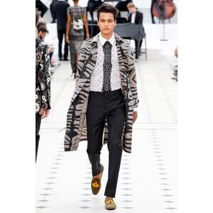 BURBERRY PRORSUM Spring-Summer 2016 trench coat comes in a grey & black print silk / wool featuring a belted style, epaulettes, belted sleeves, flap pockets, single back vent, and a double breasted closure. Made in Italy.