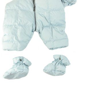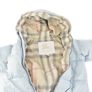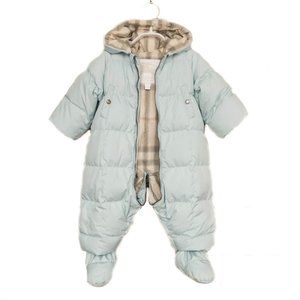 Pale blue, down insulated snowsuit with removable booties accented by beige, "Nova Check" interior and silver, metal "Burberry" logo snaps. (interior sleeve snaps for mittens; mittens not included)