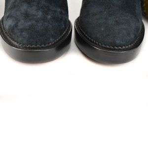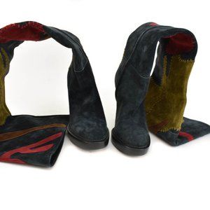 "Allison" Navy blue, suede over the knee boots with multicolor, whip-stitched patchwork detail. Runway