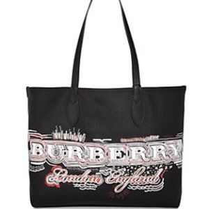 Brand new, never used BURBERRY Reversible London Doodle Tote, Black Leather-Canvas with the famous Burberry Check Interior. This style has the black, red and white logo print.