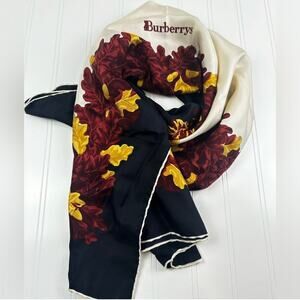 Burberrys pure silk scarf featuring a timeless autumn-inspired border design in black, cream, and maroon tones. Luxurious and lightweight, this vintage accessory adds elegance to any outfit, whether styled as a neck scarf, handbag accent, or collectible display piece. The high-quality silk ensures a soft drape and rich finish, making it both a functional accessory and a desirable fashion collectible.