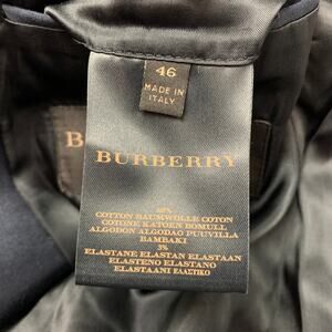 BURBERRY "Tuxedo" sport coat in a navy cotton stretch blend with a full liner featuring a peak lapel, flap pockets, and a single button closure. Made in Italy.