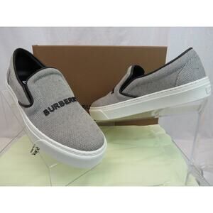 BURBERRY THOMPSON GRAY FABRIC BLACK LEATHER TRIM LOGO SLIP ON SNEAKERS 40 10
