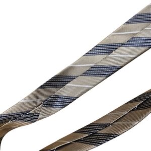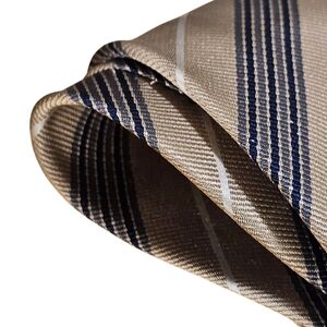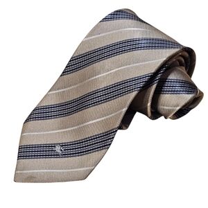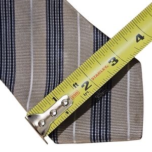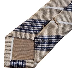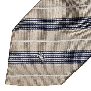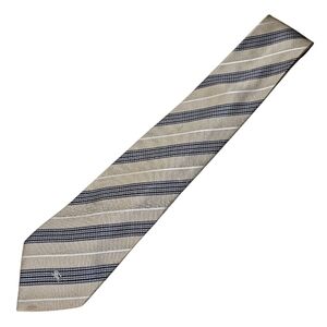 This is a very nice striped tie made by Burberry. It does have a couple of flaws, but is still wearable. The sram on the back of the tie is a bit loose. It is in no danger of coming apart. There is one puncture wound (see photo). There are also two very light stains that are hard to see in the photos and hard to see in person (see photos). They would probably come out pretty easily. The tie still looks very sharp when worn. Offers are encouraged. Thank you for looking.