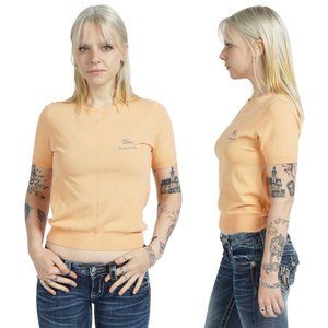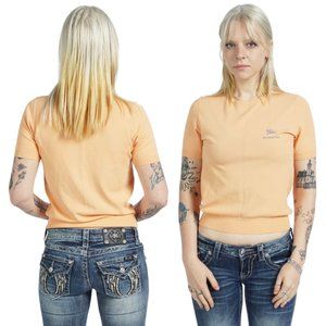 BURBERRY VTG Burberrys Logo Embroidery Peach Orange Short Sleeve Round Neck Knit Top Small Designer Streetwear Celebrity Style Cute Pastel Rare