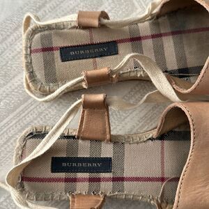 Burberry Women’s Shalicia Leather Ankle Espadrille Tan Tie Sandals. Ties around the ankle. Very comfortable. Signature plaid on bottom of shoe. Ankle strap can be worn different ways. Gently worn. The leather has marks from wear, see pictures. Comes with box and dust bag. Size 38.
