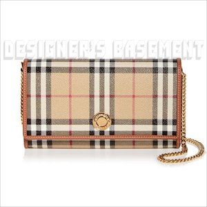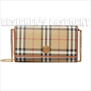 Brand New Authentic BURBERRY Hannah archive beige Leather & Vintage Check eco canvas Flap wallet clutch Chain strap cross-body convertible bag