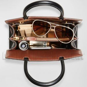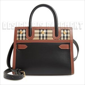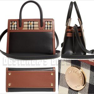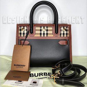 Brand New Authentic BURBERRY black with brown Leather & Vintage Check Baby TITLE double top handle Mini Tote convertible cross body bag