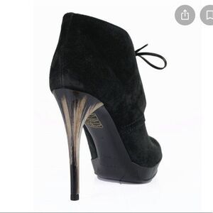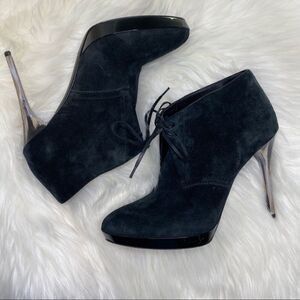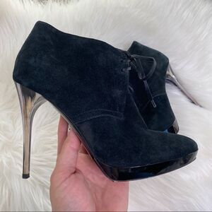 BURBERRY Proraum Black Suede English Icons Tanfield ankle bootie with marbles heel. Size 36.5 euro. Beautiful suede booties with 4.5” marbled stiletto heel. Made in Italy. See photos for detail. Very good used condition