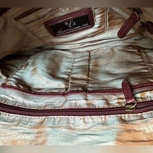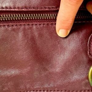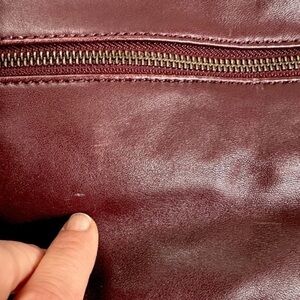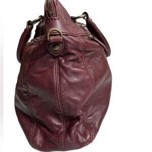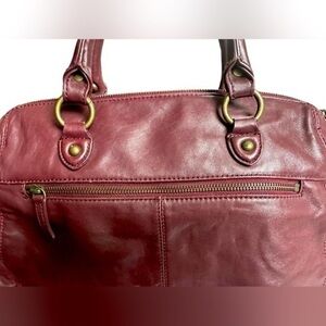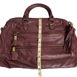 Beautiful burgundy luxe leather satchel by Rachel Zoe. This bag is approximately 17”L x 11”H and 4.5-5” wide. It is a buttery soft leather. There are plenty of pockets to organize any and all things. 2 pockets on one outer side and a larger pocket on the other. The interior is an iridescent lining with a large zip pocket and two slip pockets on one side and the other side has a large zip pockets and three slip pockets including a pen slip. It has rounded handles about 9” round. Finished with leather tassels and distressed brass hardware. There are side hooks for a shoulder strap, but I never had the strap so it’s always been a hand bag.