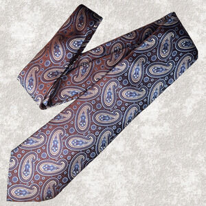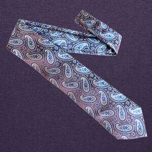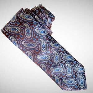 Paisley print with a brown/maroon base color, with blue and cream floral highlights in different contrasting and complementary shades.