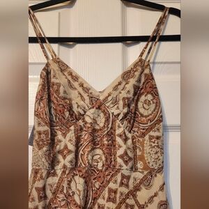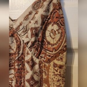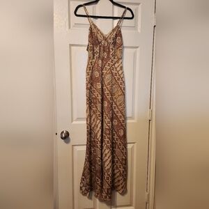 The Marrakesh Silk Maxi Dress is cut from viscose twill featuring an intricate Moroccan inspired print. Pleated V-neckline with double straps and side zipper closure. Seam at bottom of zipper started to become unstitched, has been restitched. Does not affect zipper function.