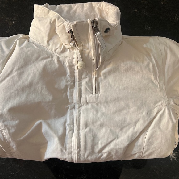 Lovely ivory color ski/snowboard jacket with purple/yellow/blue stripe detail to zipper. Note: hood missing but otherwise in great condition. Bought as extra jacket to wear with other Burton listing.