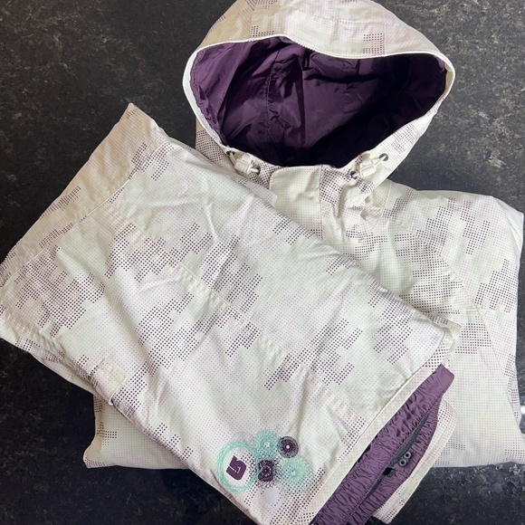 Beautiful Burton Snowboard Jacket and Matching Pants in perfect condition. Ivory with subtle purple and teal accents. Used for a one week vacation, No stains, tears.