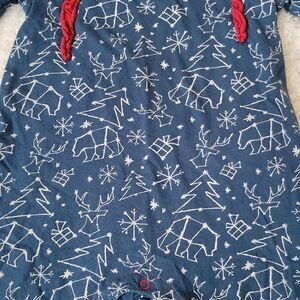 Excellent pre-owned condition, navy blue with red ruffles at shoulders, two snaps at top, snaps around the legs and elastic at the ankles, Christmas constellations pattern, 100% organic cotton.