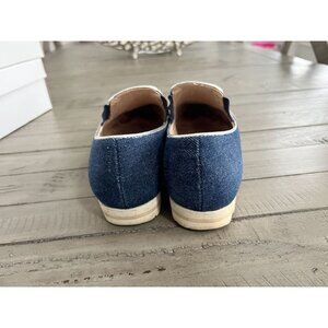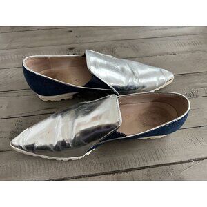 BUS STOP Comfy Cool Silver Pointy Toe Leather & Midnight Blue Denim Loafers with white lug soles. Fashion Forward, Great Contemporary Style.
