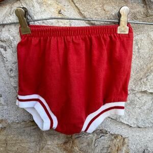 Short sleeve tee shirt with embroidered bear and red diaper cover shorts with elastic waist
