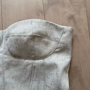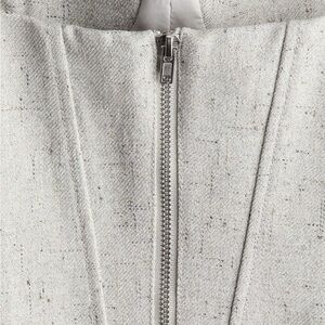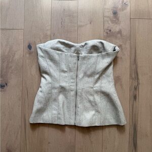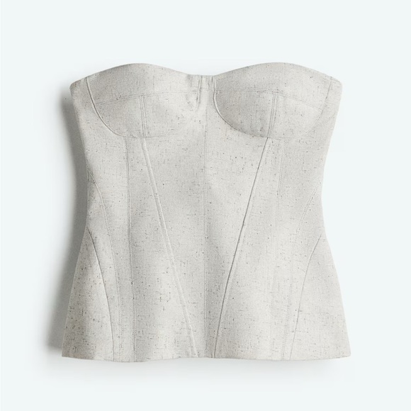 Bandeau bustier top in twill with visible seams at front and back. Lined. Padded cups, boning added in front for added support, visible zipper at the back. Light grey melange. Premium edition S/S 2025. Sold out for months!