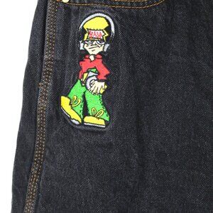 BUTTER WORLDWIDE INC. MEN'S BLUE JEAN SHORTS WITH EMBROIDERED "BASS" CHARACTER FRONT POCKET & R/BACK POCKET; DRAWSTRING INSIDE; 100% COTTON;