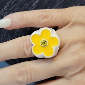 Fun and funky chunky acrylic ring featuring a yellow flower design with a sparkling gem and subtle shimmer at the center. Perfect for adding a touch of whimsy to any outfit.