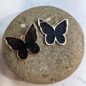 Pair of butterfly earrings with a unique black filagree style background with a raised gold tone outline