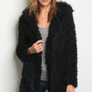 BUTTON CLOSURE & HOODED SHAGGY BLACK FAUX COAT! Long sleeve pocket detail hooded faux fur coat. two pockets, button closures throughout & hooded. Great addition for your fall & Winter wardrobe.